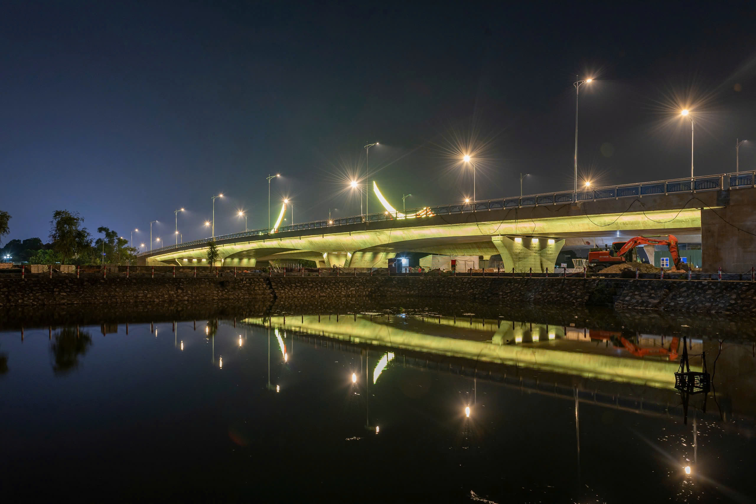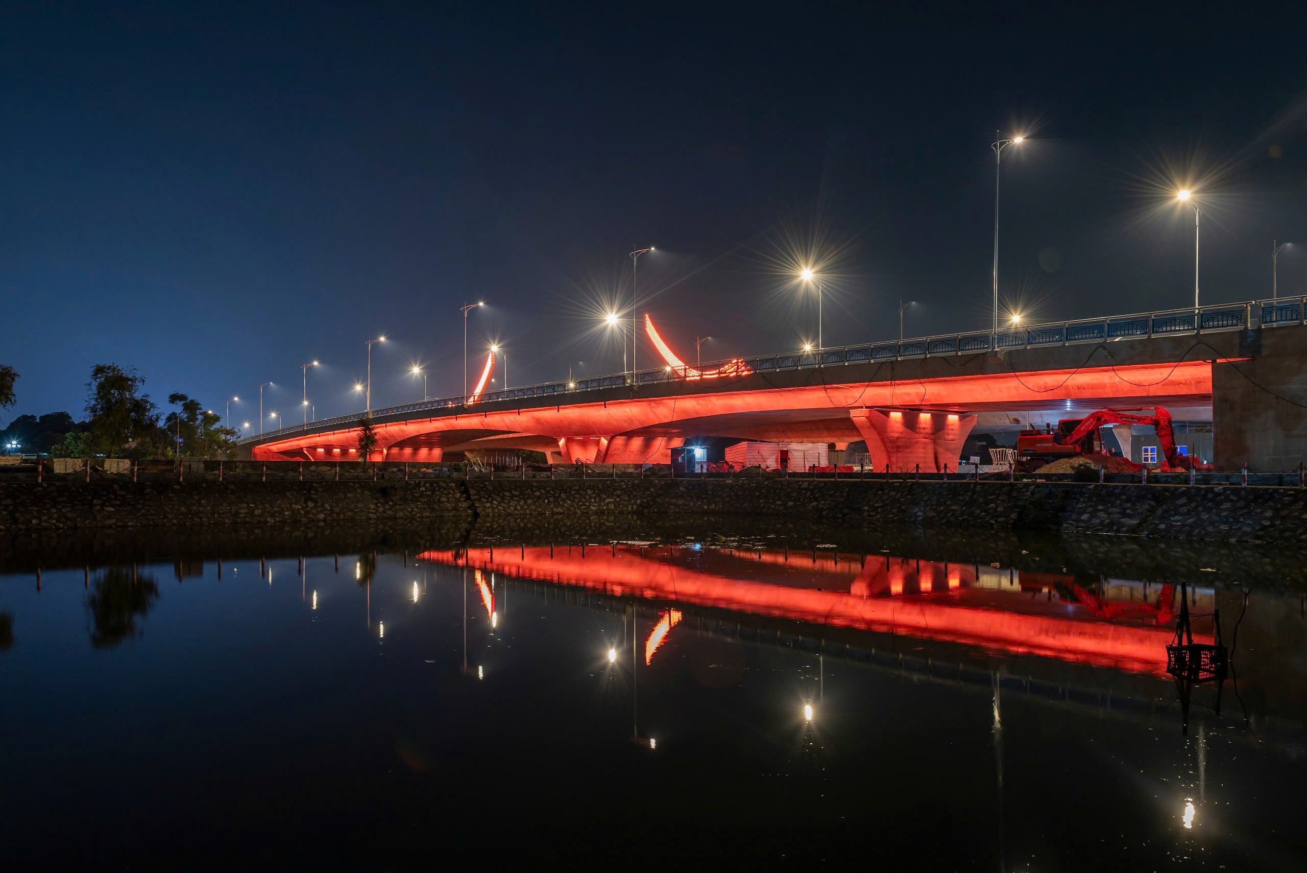 Hệ thống chiếu sáng không chỉ giúp đảm bảo an toàn giao thông ban đêm, mà còn mang đến hiệu ứng mỹ thuật tinh tế, làm nổi bật các đường nét kiến trúc của cầu trong không gian đô thị.